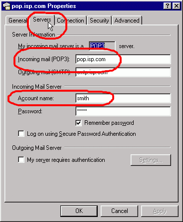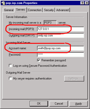 SpamWeasel Support Issues Outlook Express configuration 1 Click on Tools | Accounts. ![]() 2 Double-click on the account you wish to use with SpamWeasel. ![]() 3 On the screen that appears, select the "Servers" tab. This will show your current settings. ![]() 4 At the end of the "Account name" field, type an "@" sign, followed by the contents of the "Incoming mail (POP3)" field. Next, change the "Incoming mail (POP3)" field to "127.0.0.1". Click OK to apply the settings. ![]() Timeouts You may wish to change the timeout setting in your e-mail client. More information on why this may be required can be found here. To change the timeout settings, select the "Advanced" tab. You can increase the timeout setting here. ![]() |