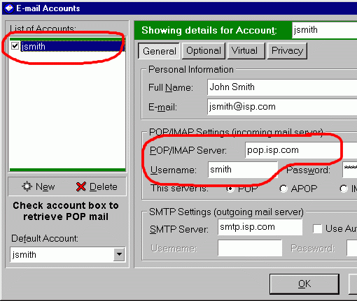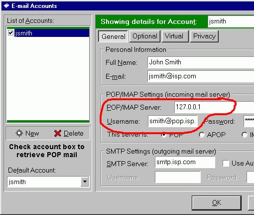 SpamWeasel Support Issues Pocomail configuration 1 Click on Tools | Acounts Setup. ![]() 2 On the screen that appears, select your account from the left-hand pane, and this will show your current settings. ![]() 3 At the end of the "Username" field, type an "@" sign, followed by the contents of the "POP/IMAP Server" field. Next, change the "POP/IMAP Server" field to "127.0.0.1". Click OK to apply the settings. Note: Make sure that the "Use Authentication" box to the right of the SMTP Server field is not checked. ![]() Timeouts You may wish to change the timeout setting in your e-mail client. More information on why this may be required can be found here. To change the timeout settings, click on Tools | Options. ![]() ... Select "Network Settings" from the left-hand side. You can increase the timeout setting here. ![]() |