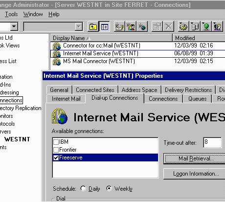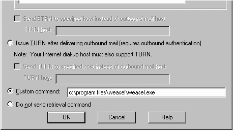 POPWeasel Support Issues Q. How do I set up POPWeasel to work with Exchange 5.5? A. For guidance in setting up a POP3 feed to your SMTP server, consult your installation manual. The notes below refer explicitly to MS Exchange Server version 5.5, but will lend an understanding to the setup of any SMTP server requiring a POP3 feed. POPWeasel may be installed to use MS Exchange Server so that Exchange provides the connection, scheduling and dial-up control. This is managed by the Internet Mail service. If you do not have this service installed, refer to your Exchange documentation for instructions on how to install and configure it. To setup POPWeasel with Exchange 5.5: 1) Select your site, select Configuration, and then select Connections. ![]() 2) Double-click on the Internet Mail Service. 3) On the Dial-up Connections tab, from the Available Connections box, select the connection you wish POPWeasel to collect for. ![]() 4) Click on Mail Retrieval for each connection you wish to collect from. In the Mail Retrieval box, select Custom Command, and type in: "C:\program files\weasel\weasel.exe" or whatever your path to weasel.exe is. ![]() NOTE: If you have problems with the connection being dropped while POPWeasel is working, increase the time-out in Exchange in the 'Timeout after' field on the dial-up connections tab in the Internet Mail Service (IMS) configuration dialog. |